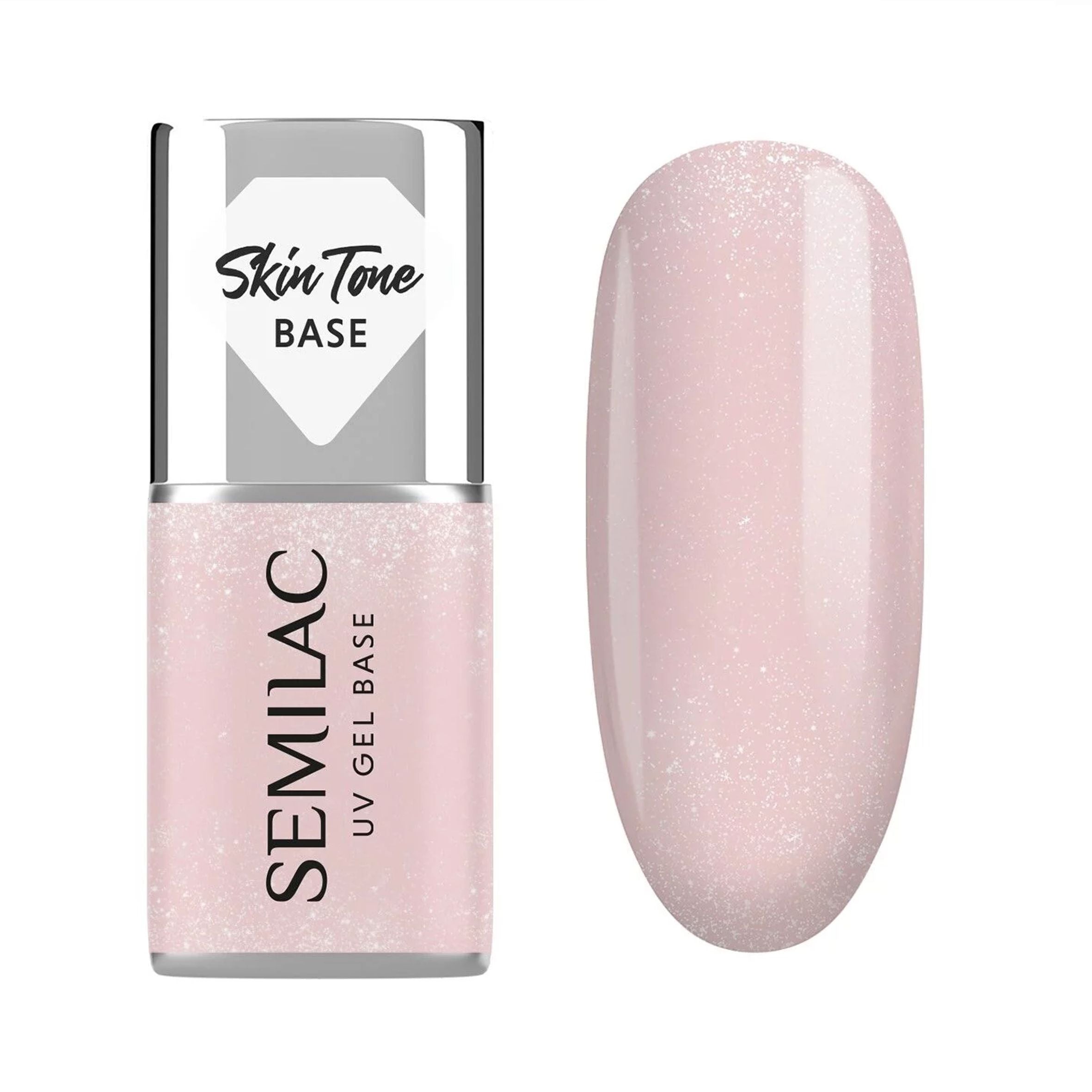 Cover Base Glitter Beige de Semilac: base semiopaca en beige frío con un toque de rosa y destellos plateados. Fórmula elástica que se adapta a cualquier uña.
